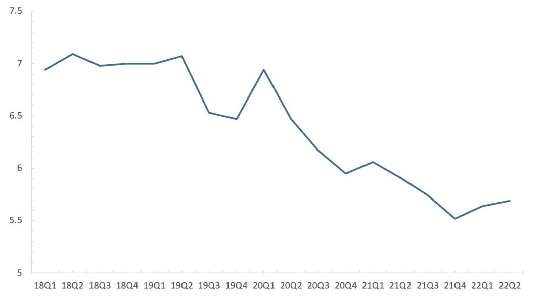 费用方面,腾讯的期间费用支出总额(销售及市场推广开支+一般及行政开支,即SG&A)从2022Q1开始环比下行,但受到收入环比下降之影响,2022Q2的期间费用率录得25.49%,仅环比微降0.14pct。