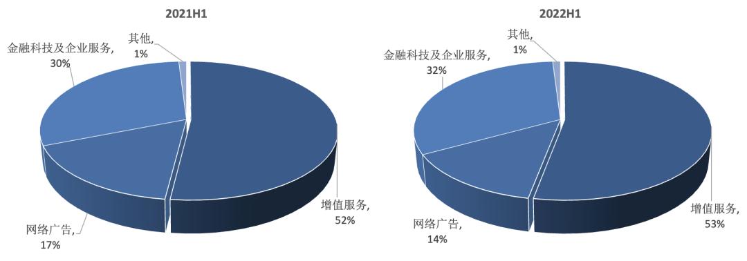 收入结构方面,腾讯的收入主要来自增值服务、网络广告、金融科技及企业服务这三大业务。其中,以游戏、视频直播、数字内容订阅等为核心内容的增值服务业务始终是腾讯的收入支柱,该业务在2022Q2实现收入717亿元,收入占比录得53%。