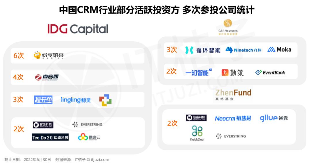 金沙江创投在 16 家 CRM 企业中投资 25 次;真格基金则是在 16 家 CRM 公司中出手 21 次。