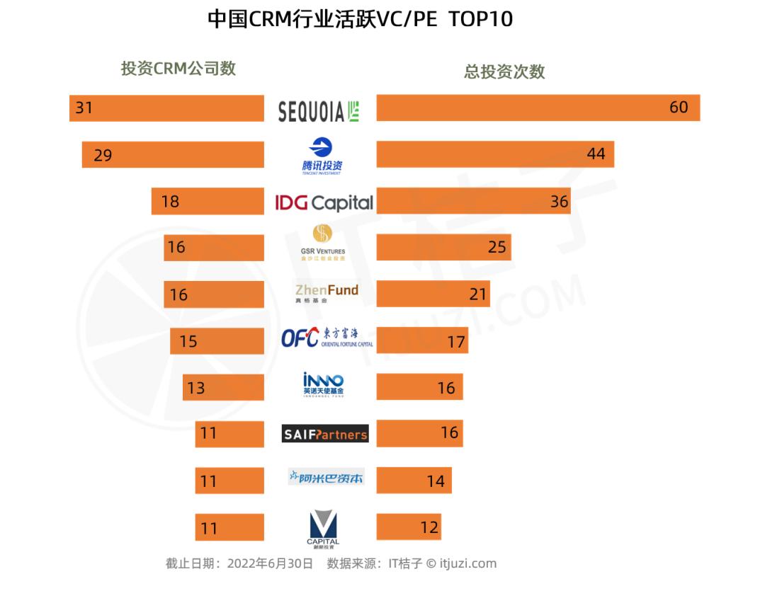 IT 桔子数据显示,中国 CRM 行业活跃投资方 TOP10 分别为:红杉中国/红杉种子基金、腾讯、IDG 资本、金沙江创投、真格基金、东方富海、英诺天使基金、赛富基金、阿米巴资本、深创投。