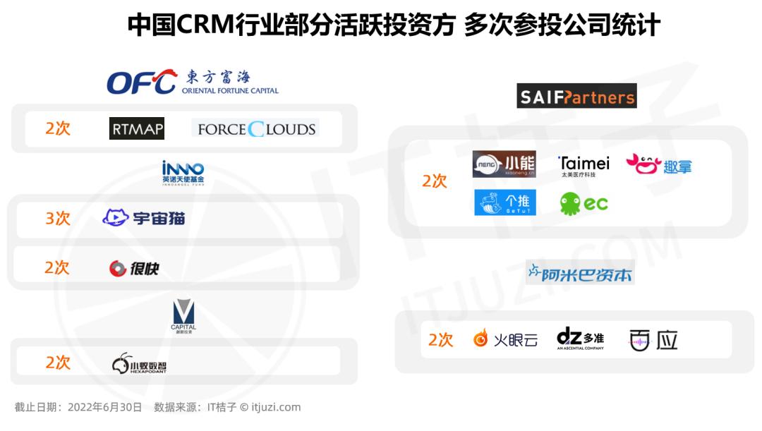 除此,中国 CRM 行业活跃投资方还有东方富海、英诺天使基金、赛富基金、阿米巴资本和深创投。这 5 大资本多次投资同一家 CRM 公司的概率并不高。