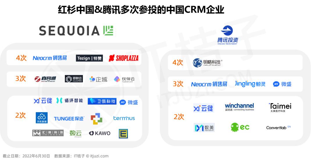 红杉中国多次投资的中国 CRM 企业有销售易、特赞、店匠科技、容联云通讯等;腾讯多次参投的项目还有明略科技、销售易、微盛、鲸灵集团、Convertlab 等。