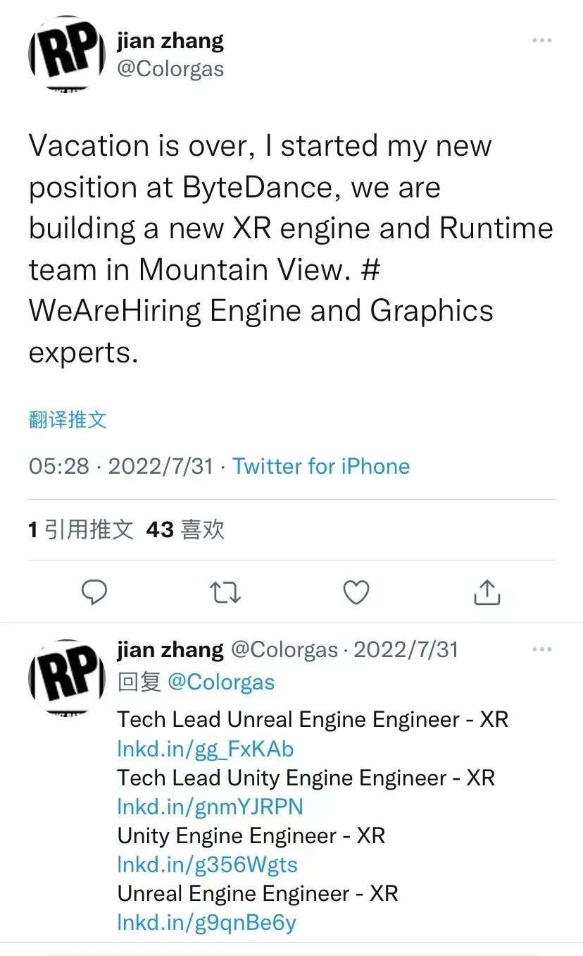 另一个被外媒热炒的消息是:7月31日,Meta 前软件工程师Jian Zhang在推特发文表示正式入职Pico的美国团队,并积极招募团队成员。