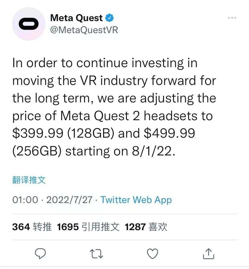 同样在7月底,Meta 取消了对Quest 2的价格补贴——Meta称,由于全球经济下滑导致制造和运输成本上升,从8月1日开始,所有型号的头显产品价格都将上调100美元。