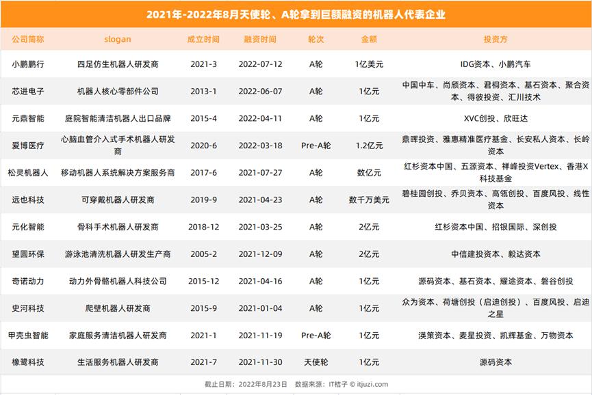 从机器人行业已上市或成为独角兽的企业来看,多家公司在天使轮、A 轮拿到的钱大多集中在百万或千万级别,很少有公司在融资初期阶段就拿到上亿元融资。但随着机器人行业日渐受到关注,IT 桔子数据显示,自 2021 至今不少企业在天使轮、A 轮阶段就拿到巨额融资。