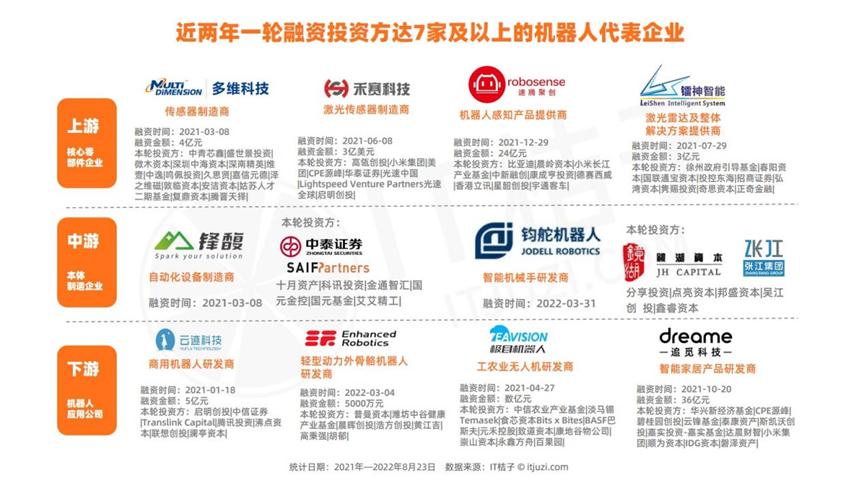 IT 桔子数据显示,2021 年至今一年半的时间,中国机器人行业投融资事件已超 400 起,其中近 100 家公司在此时期收获 2 轮融资,近 30 家公司收获 3 次融资,甚至有公司在一年的时间里获 4 次融资。