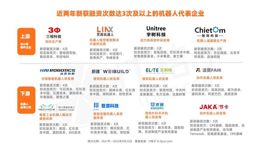 具体来看,产业上游的电机生产商「三相科技」、 机器人视觉智能解决方案供应商「灵西机器人」,下游的仓储智能机器人研发商「海柔创新」、建筑机器人研发商「蔚建科技」自 2021 年至今共获 4 轮融资。