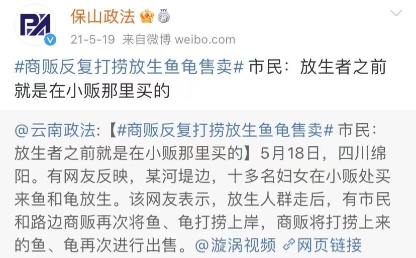 相比每周一随手转发锦鲤保佑工作顺利,只求心诚则灵的打工人,亲自带着动物的“放生人”,无疑更具有实践精神。