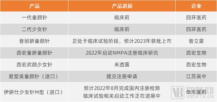 除了已有产品上市的圣博玛之外,近一年来,金坤生物、普立蒙等多家公司获得融资;四环医药、江苏吴中等上市公司也在将医美业务扩大至医美再生产品。在资本助力、大公司布局下,目前至少已有7款童颜针和少女针产品处于研发或注册阶段。