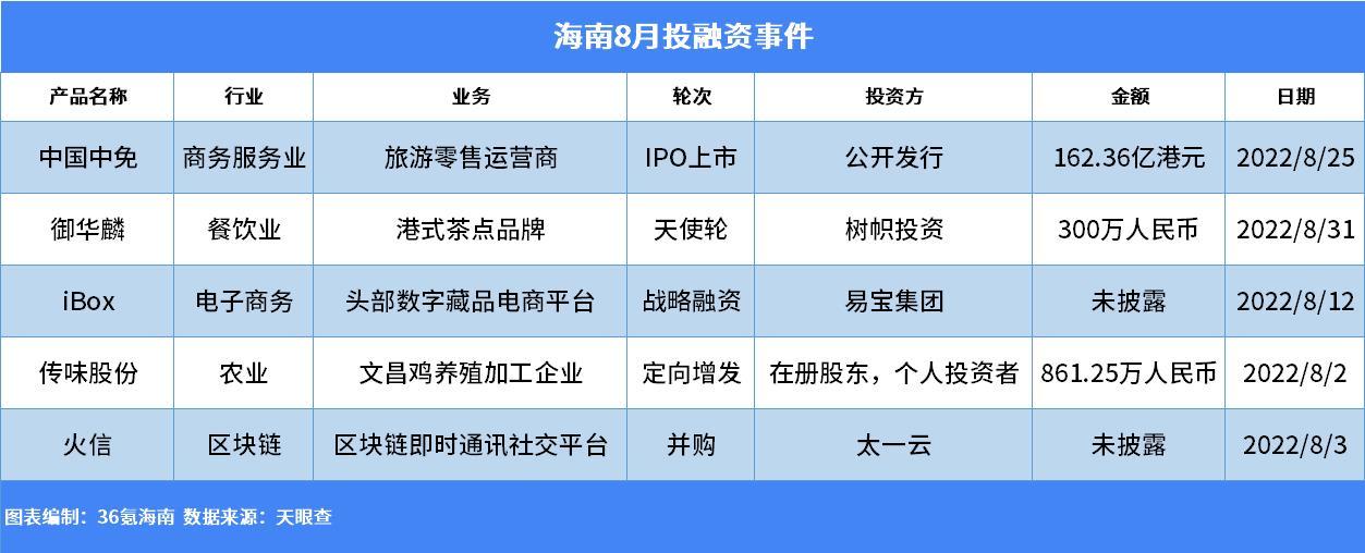 8月,36氪海南统计了海南省内发生的5起投融资交易事件,相关企业5家,其中IPO上市1起:中国中免;天使轮1起:御华麟;战略融资1起:IBOX;定向增发1起:传味股份;并购1起:火信。涉及5大行业:商务服务业、餐饮业、区块链、电子商务、农业。