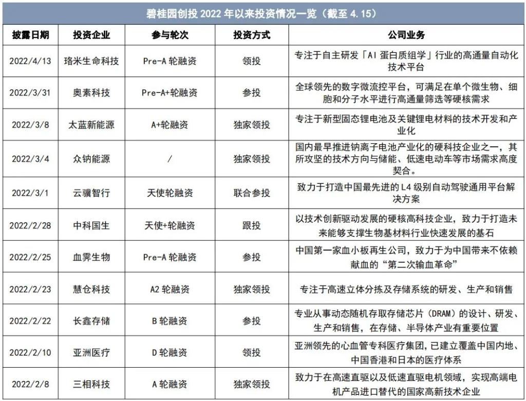 碧桂园创投2022年截至4月13日前投资情况一览 图片由碧桂园创投提供