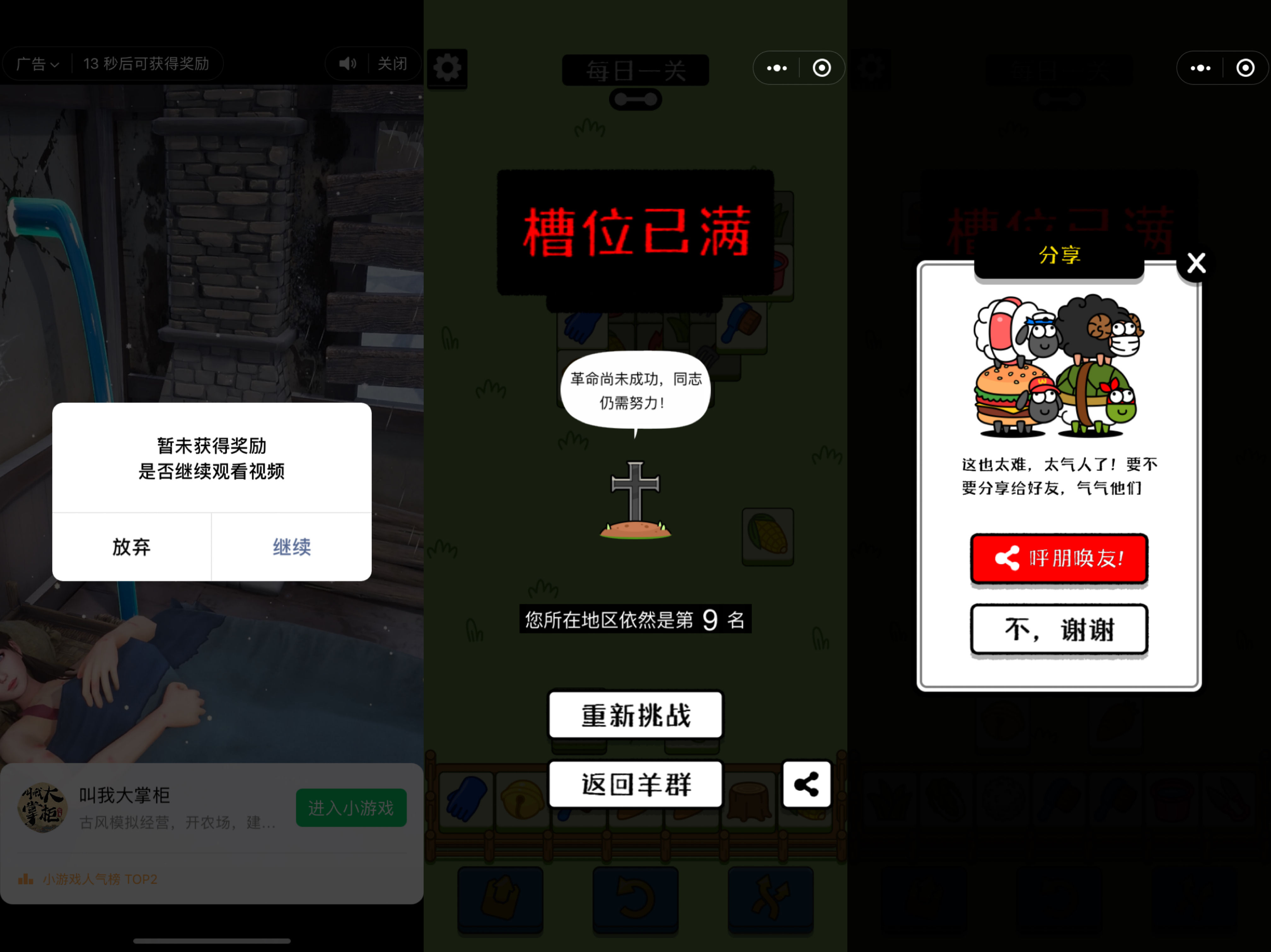 玩家被这种“只差一点点”的错觉吊着,就会反复失败,反复尝试。有玩家抱怨,《羊了个羊》简直是“游戏界的拼多多”,因为像“砍一刀”一样,“永远只差 0.01”。