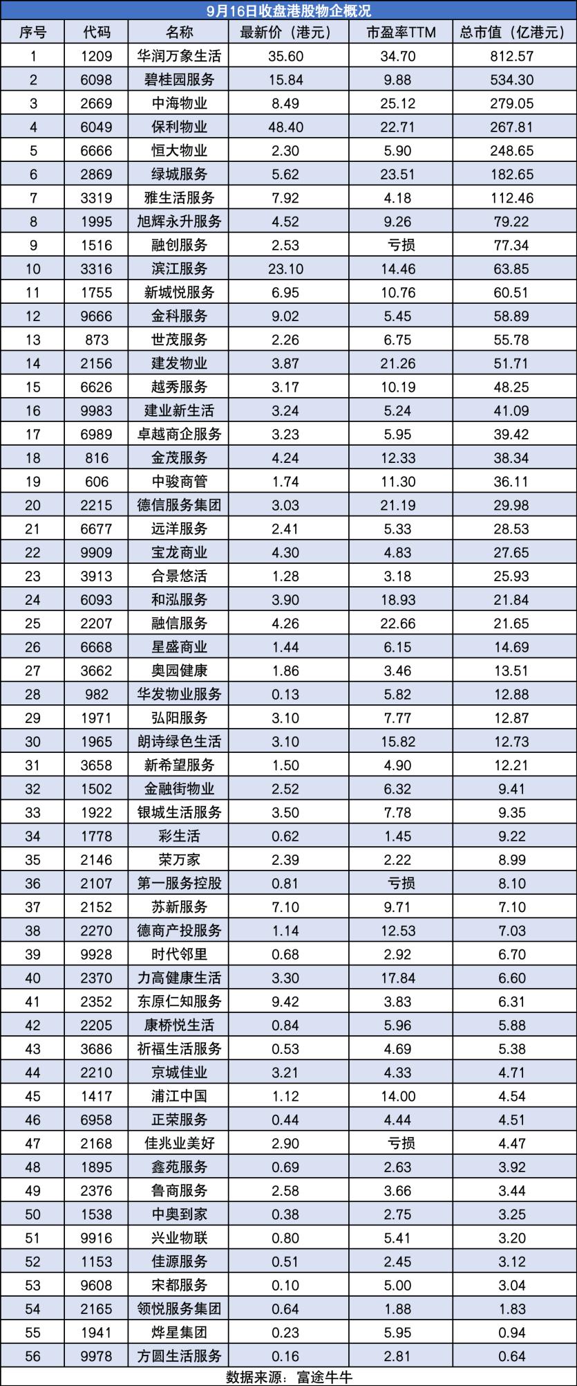 截至9月16日收盘,华润万象生活(01209.HK)与碧桂园服务(06098.HK)的总市值分别为812.57亿港元、534.30亿港元,排在他们后面的两家央企物业股——中海物业(02669.HK)、保利物业(06049.HK)总市值分别位279.05亿港元、267.81亿港元。
