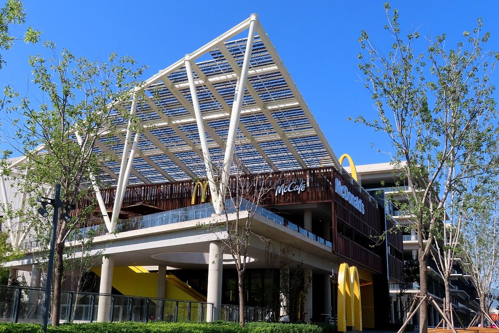 北京麦当劳首钢园得来速餐厅外观,屋顶铺设光伏发电系统。图片来自麦当劳。