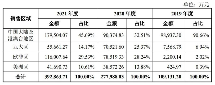 2019-2021年,华大智造来自中国大陆及港澳台以外地区的收入占比分别为9.34%、67.49%和54.31%,收入占比大幅增长,呈逐年增长趋势,尤其2020年取得明显放量。