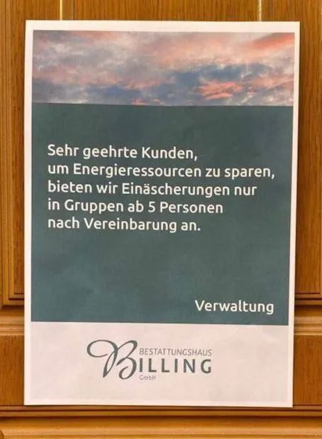 在天然气短缺的背景下,许多火葬场已大幅提高了火葬的价格,不涨价的话,火葬场只能在如何节省能源上想办法——例如,德国奥格斯堡正打算修订法律,将法律规定的最低火化温度从850度降低为750度,从而节省10%到20%的天然气。