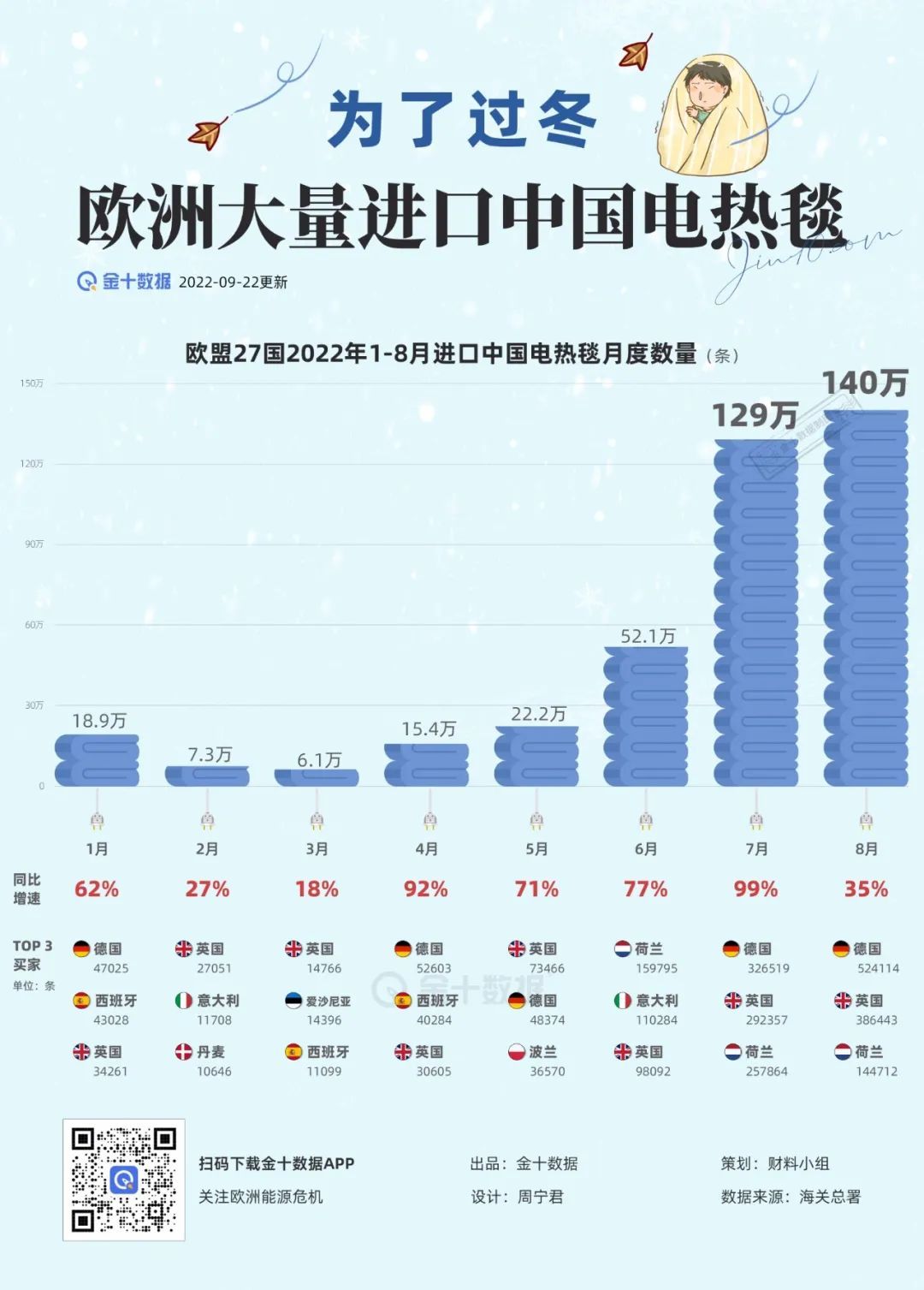 为了“低成本”过冬,欧洲人紧急备货取暖设备,中国的电热毯竟成了欧洲人的“冬季救星”!同时也带动了电暖器、暖宝宝、热水袋、取暖炉等中国取暖“神器”出口数量。