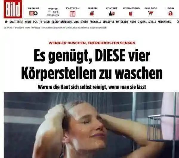 对于最依赖俄罗斯天然气的德国也建议人们少洗澡,如果实在要洗只洗四个部位。