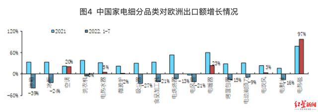 中国家用电器协会数据显示,2022年以来多数家电产品对欧洲出口额呈下降态势,而增长的品类主要包括空调、电热水器、电暖器、电热毯、电吹风,1-7月累计出口额规模分别为19.9亿美元、1.3亿美元、4.9亿美元、3340万美元、1.6亿美元,其中电热毯以97%的增速引领其他品类。