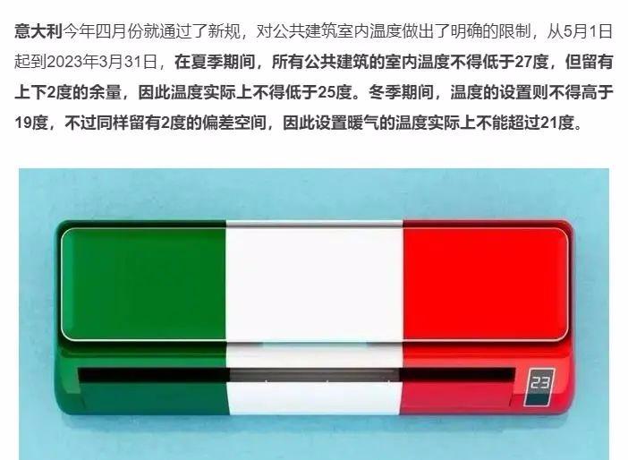 4、意大利:引入室内温度限制:冬天取暖时不高于19°C,夏天使用空调时不低于25°C;