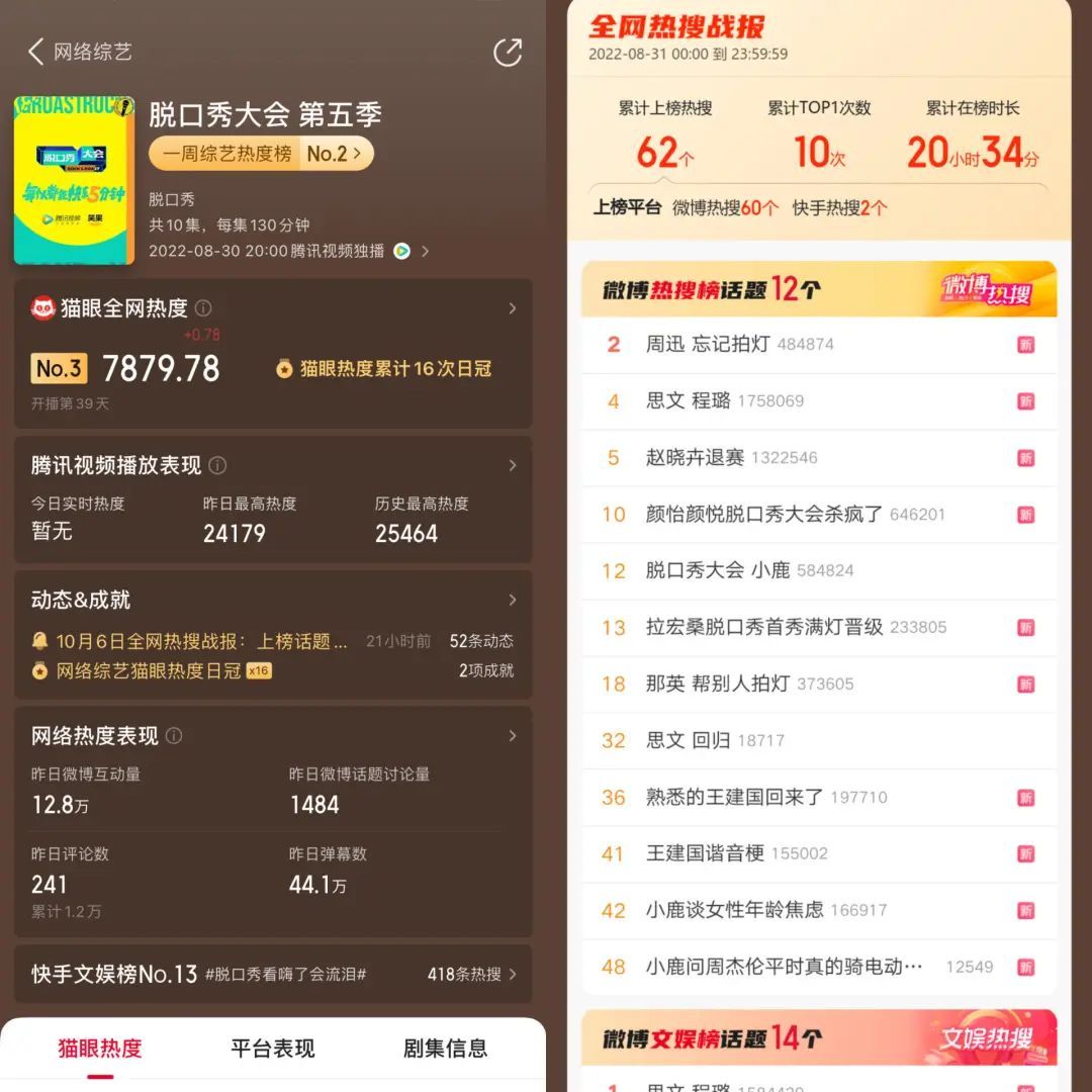 #House的炒股段子被戏称为 “脱口秀第一股”#,#孟川说李诞的腹肌是虾线#、#王建国出门没有人情全是事故#等上百个话题,在一个多月间频频登上全平台热搜。据猫眼专业版数据,截至10月7日22时,《脱口秀大会5》获得网络综艺热度日冠16个,仅8月31日,《脱口秀大会5》的全网上榜相关话题就达到了62个,其中60个在微博。