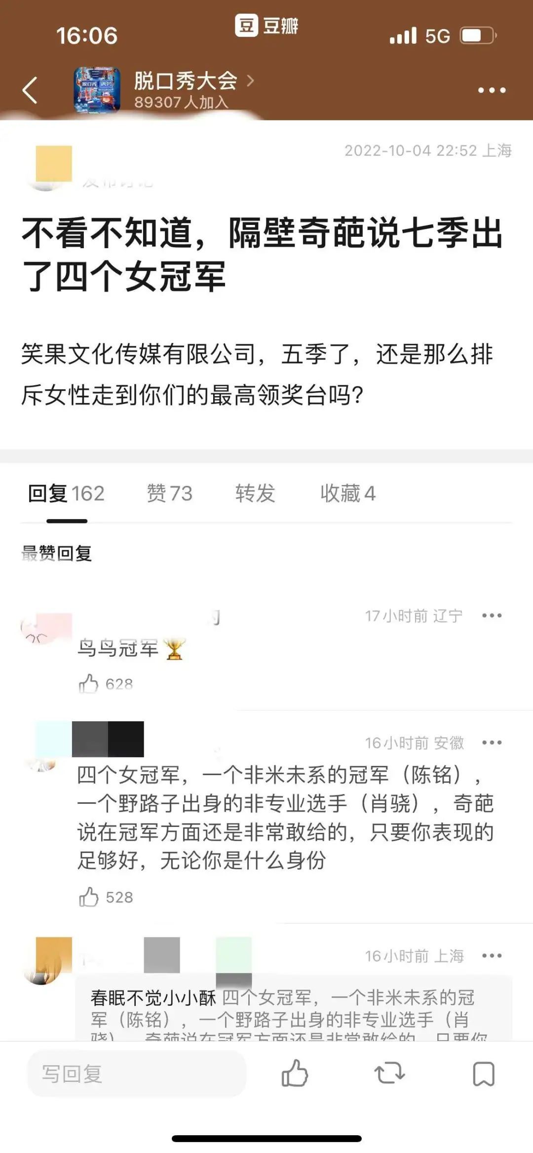 而相反,在豆瓣《脱口秀大会》的小组中,有粉丝感慨,“不看不知道,隔壁的《奇葩说》进行了7季,4季大王颁给了女性,1个非米未系的冠军(陈铭),一个野路子出身的非专业选手(肖骁),奇葩说在冠军方面还是非常敢给的……”