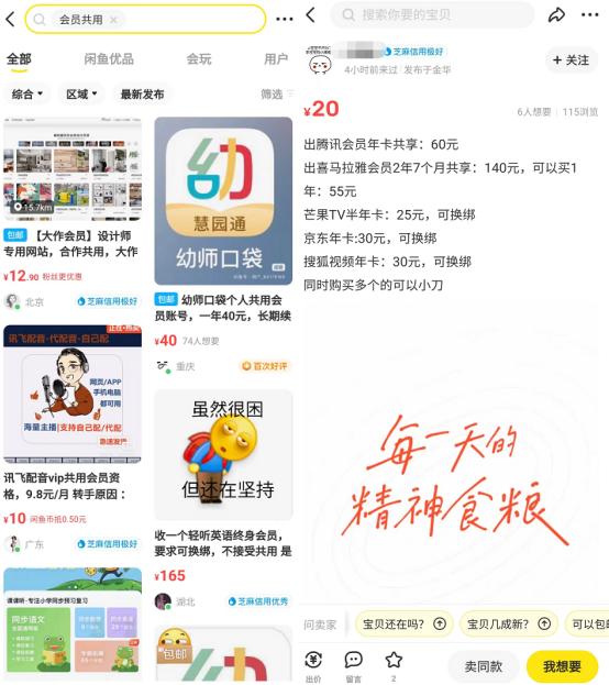 以闲鱼为例,搜索“会员共用”可以得到多条结果,且覆盖平台广泛。影视平台只是其中一个分支,还有音乐、听书、电商、设计专业软件等会员账号的分享,甚至还包括线下的超市会员卡等。