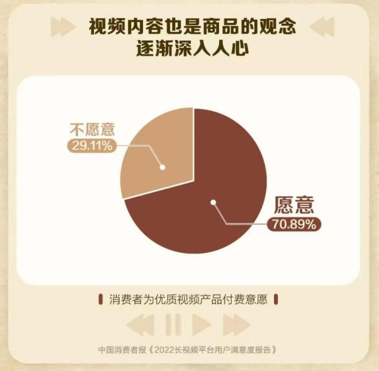 《中国消费者报》在《2022长视频平台用户满意度报告》指出,70%以上用户愿意为优质内容买单;在提前告知用户规则的前提下,59.14%的用户希望平台能够分层级付费,消费需求呈现细分趋势;有近60%的用户表示愿意为直播、番外、彩蛋等喜爱的IP衍生内容付费。