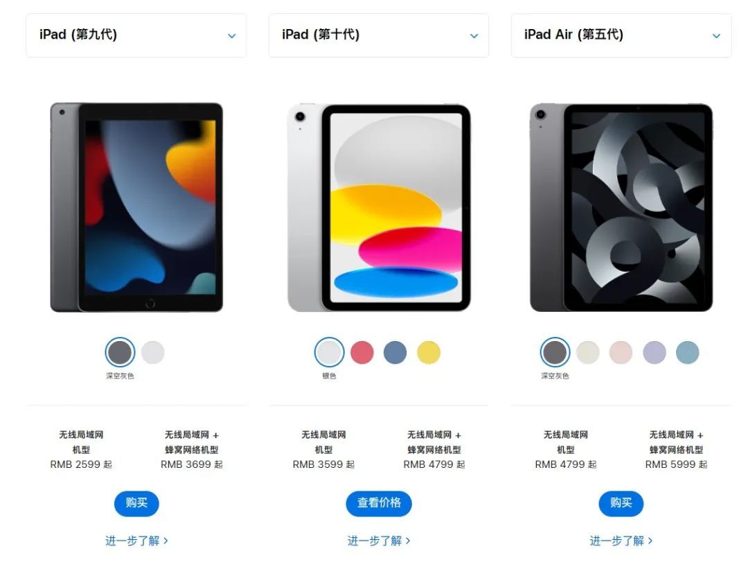 最重要的一点,便是价格。iPad 10 的起售价为 3599 元,蜂窝网络版起售价为 4799 元,对比 iPad 9 的首发价分别涨了 1100 元和 1300 元。想用 iPad 入门款的钱买 iPad Air?不存在的。