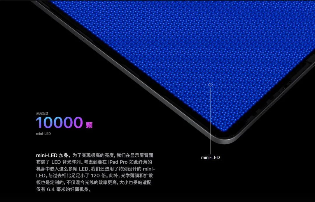 还有依然顶级的屏幕。M2 iPad Pro 的 12.9 英寸款搭载 mini-LED 显示屏,2596 个全阵列局部调光区,1000 尼特最大全屏亮度、HDR 下 1600 尼特峰值亮度。11 英寸款虽然无缘 mini-LED,但是有 600 尼特峰值亮度、祖传的 120Hz 自适应刷新,也算是不落下风。