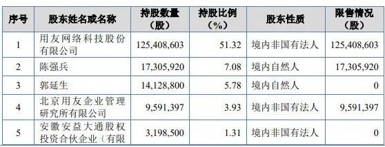 直通北交所(ID:tobse666)翻阅招股说明书发现,新道科技控股股东为上交所主板公司用友网络,用友网络对新道科技处于绝对控股,持有新道科技1.25亿股股份,占比51.32%。