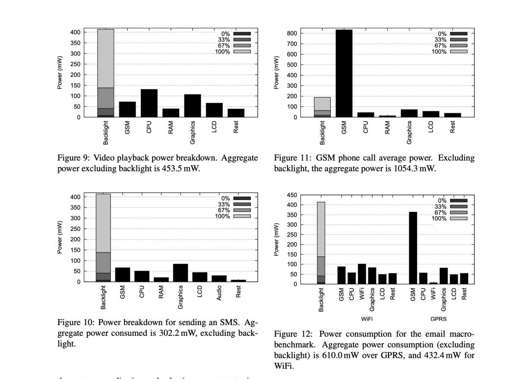 视频播放、发送短信、打电话、电子邮件四种场景下的功耗测试丨图片来源 NICTA(澳大利亚国家信息与通信技术研究机构)在 2010 年发布一项报告