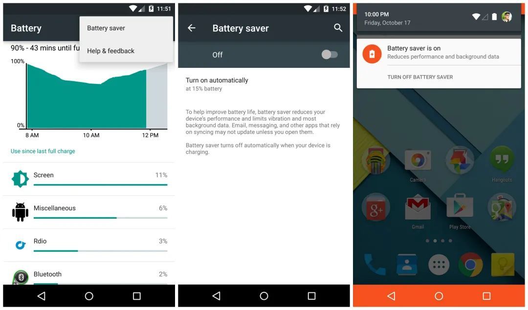 安卓系统直到更新 5.0 时,才加入官方的省电模式,开启后会降低性能,延迟部分程序的自动更新。