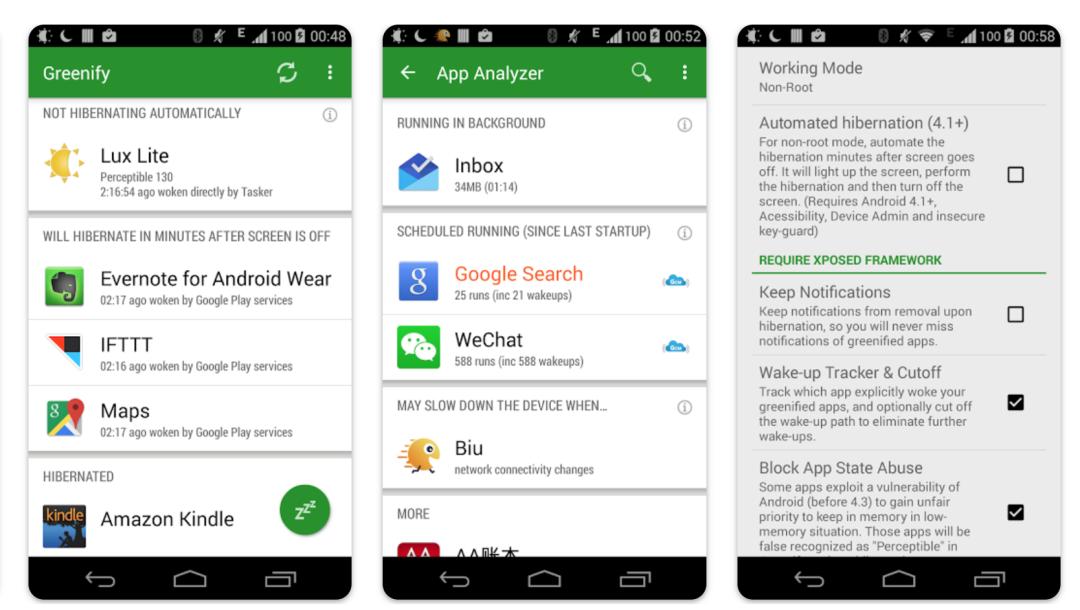 现在还能找到“教开发者如何做一款省电的安卓 ROM”一类文章。移动互联网时代的首批极客,通过将手机 root,安装 Xposed 框架,使用“绿色守护”等软件管理后台,防止应用在锁屏时被自动唤醒。经过这样的“极致调教”,好一点的续航能力能达到三四天左右。