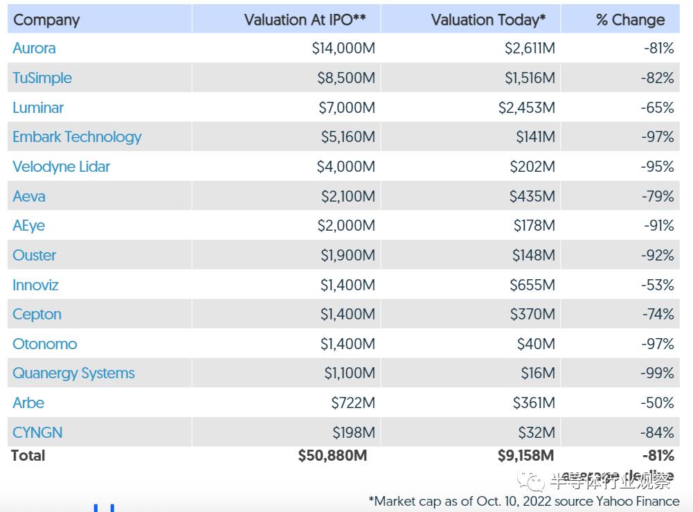 除此之外,他们还需要面对跳水式暴跌的市值。追踪初创企业估值和投资的 Crunchbase在其市场报告中统计了14 家自动驾驶技术的相关公司,其中包括Luminar、Velodyne Lidar、Aeva、AEye、Innoviz、Ouster、Cepton、Quanergy Systems等在内,数家激光雷达厂商的市值可以用惨烈来形容。Quanergy Systems跌幅达到99%、Velodyne Lidar 跌幅达95%、Ouster跌幅达到92%、AEye也有91%,相比下Innoviz跌幅最低,为53%,但与IPO时相比,市值也已腰斩。据了解,为了降低退市风险,Quanery今年完成了反向股票拆分,估值进一步下跌。