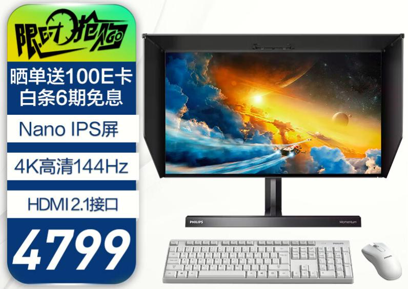 亮点:NanoIPS、4K 144Hz、1ms、HDR600、内置音箱搭载 DTS 音效、升降旋转支架、流光溢彩、配备遮光罩