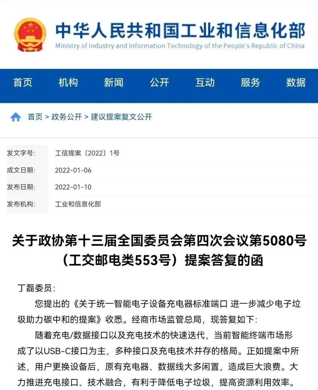 2022 年一月,作为全国政协委员、网易 CEO 的丁磊,提交了一份《关于统一智能电子设备充电器标准端口进一步减少电子垃圾助力碳中和》的提案。内容正是关于提出通过立法推动电子设备以 USB-C 接口为标准实现充电技术上的规范与统一。