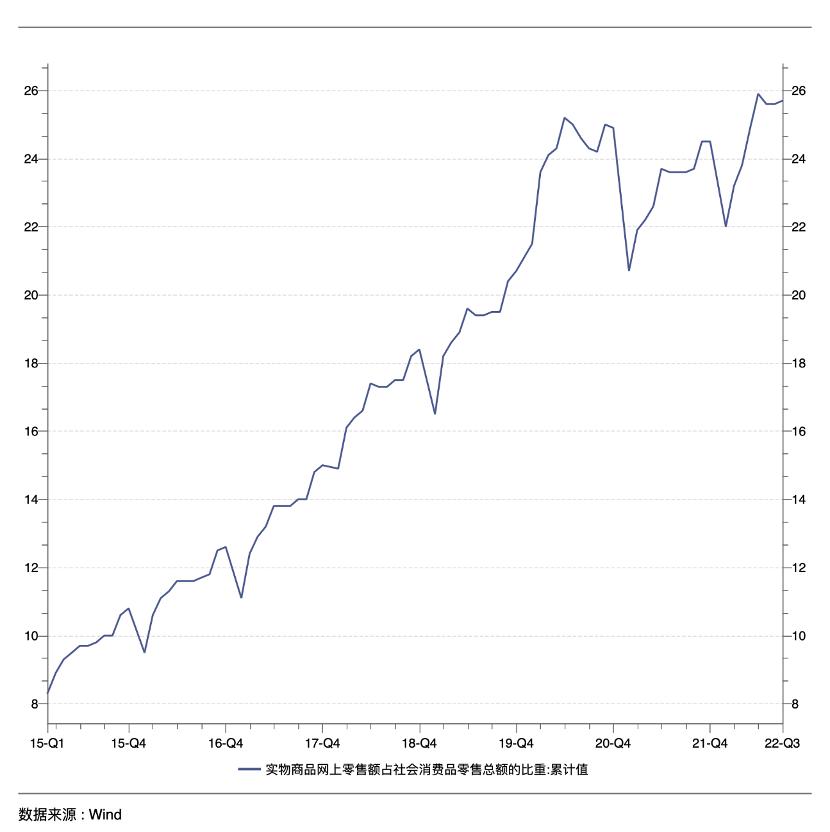在上图中可以看到,2020年之后确实短期内迅速拉动了线上实物电商的渗透率,但从此之后便进入了平台期,数据中枢围绕25%上下浮动,较之传统零售方式,线上零售的边际收益狂飙的优越性无疑是在褪去的。