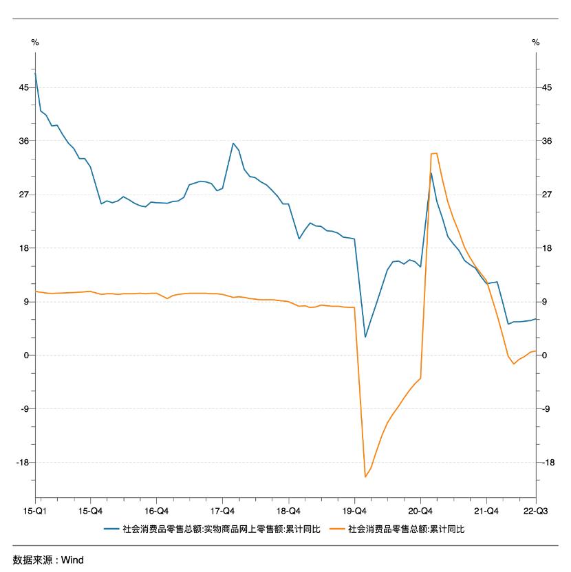我们用社零总额与线上实物零售累计值同比变动做对比,可以非常直观看到两条折线的增速差在逐渐收敛,2021下半年后两条线几乎要重合。我们固然可以用“疫情下内需不足”来自我安慰,但放长时间线去看,线上实物电商增速变缓的趋势又是无可争议的。