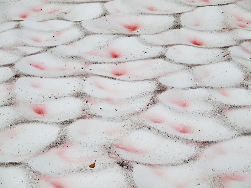 这种红色的藻类,在温度低于水的凝固点时,会进入休眠状态, 当气候变暖,温度升高会“激活”藻类体内的虾青素,从而变红,以保护自己免受太阳破坏性的紫外线辐射 。