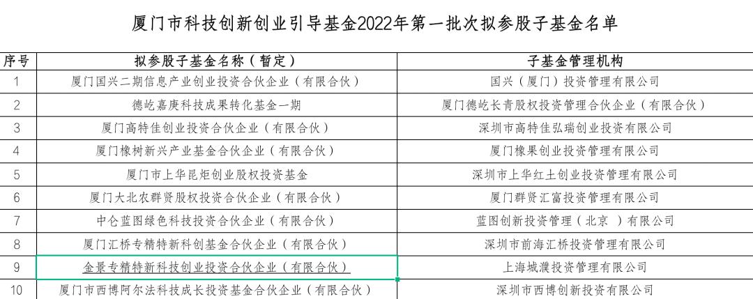 投资界-解码LP获悉,厦门市科学技术局近日公告,公布了厦门市科技创新创业引导基金2022年第一批次拟参股子基金名单,本次引导金共出资10支子基金,分别为——