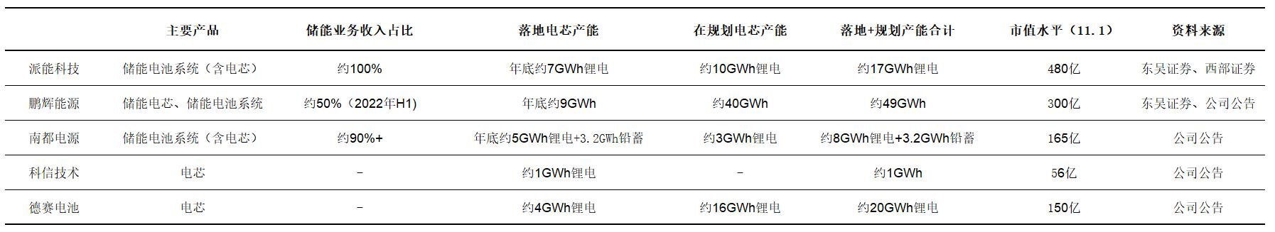 从对标企业的估值来看,目前市场上单纯以储能电芯为主业的企业并不多,目前已在储能电芯方面产生收入的企业主要包括派能科技、鹏辉能源、南都电源、天能股份、科信技术等。