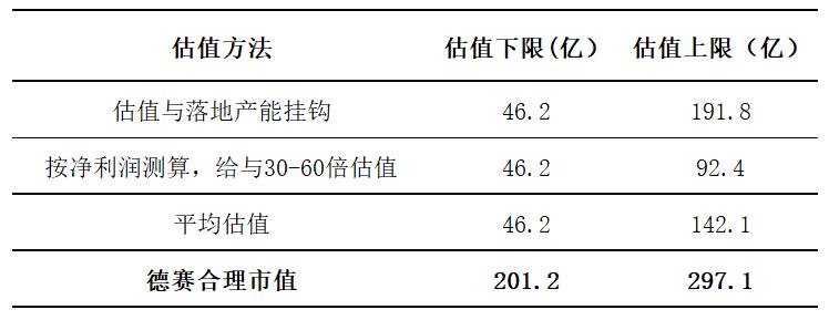 再将德赛电池储能项目的估值加总到德赛电池目前的市值后,德赛电池的合理市值约为201.2-297.1亿元。