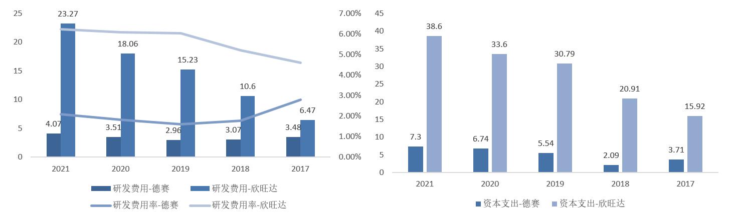 在两公司战略导向的差异下,欣旺达无论是在研发投入,还是资本支出方面,均远高于德赛电池。2017到2021年5年间,欣旺达累计研发费用73.63亿元,累计资本支出139.82亿元;而德赛电池累计的研发费用仅17.09亿元,累计资本支出也只有25.38亿元。