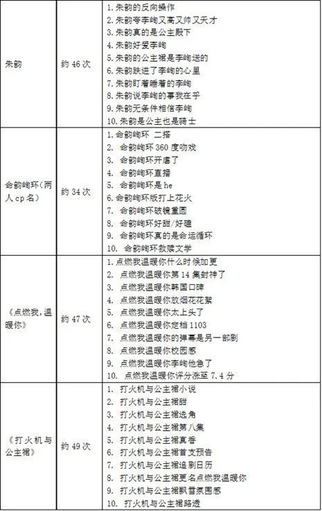 据不完全统计,微博相关热搜多达三百余条,内容五花八门,可真谓“百花齐放春满园”。但经整理发现,热搜词条主要集中在男女主角本人的颜值、性格、行为、状态,剧目角色的互动以及二人之间爱情的蛛丝马迹,剧情精彩点与观众反应等主题。这也是影视剧常见的营销视角,用人、话、梗、画面、情节、观众反馈、热点等作为切入点为舆论造势,意在借助舆论之火,点燃剧目热度和讨论度。再让明星与唯粉、CP粉、剧粉、书粉等进行互动,联合抖音、微博等主流平台进行宣发营销,多向传播的加持下,剧集热度也就自然而然容易走高。然而,此剧营销攻势凶猛,一方面确实提高了剧集关注度,另一方面却也让观众槽声连天。
