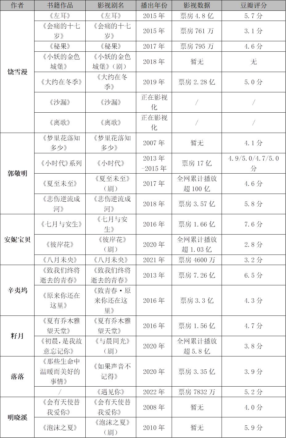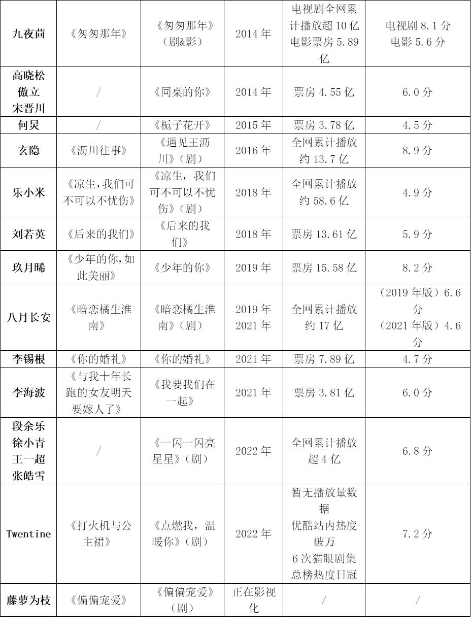 以上列举的影视剧目都是以青春为主题,或多或少都夹杂着青春期的“疼痛”。不难看出,从2007年郭敬明的《梦里花落知多少》开始,这类题材的影视剧目便层出不穷。以上已经影视化的37部作品中,达到6.0分以上的不过10部。吊诡的是,其中高票房/播放量但低口碑的作品占据了大多数,真正扑得结实的反而不多。