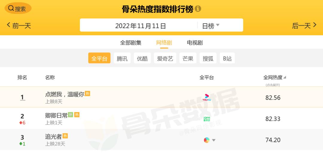 从11月11日骨朵数据、艺恩数据两个网络影视数据平台的统计结果来看,该剧都是不容忽视的存在。