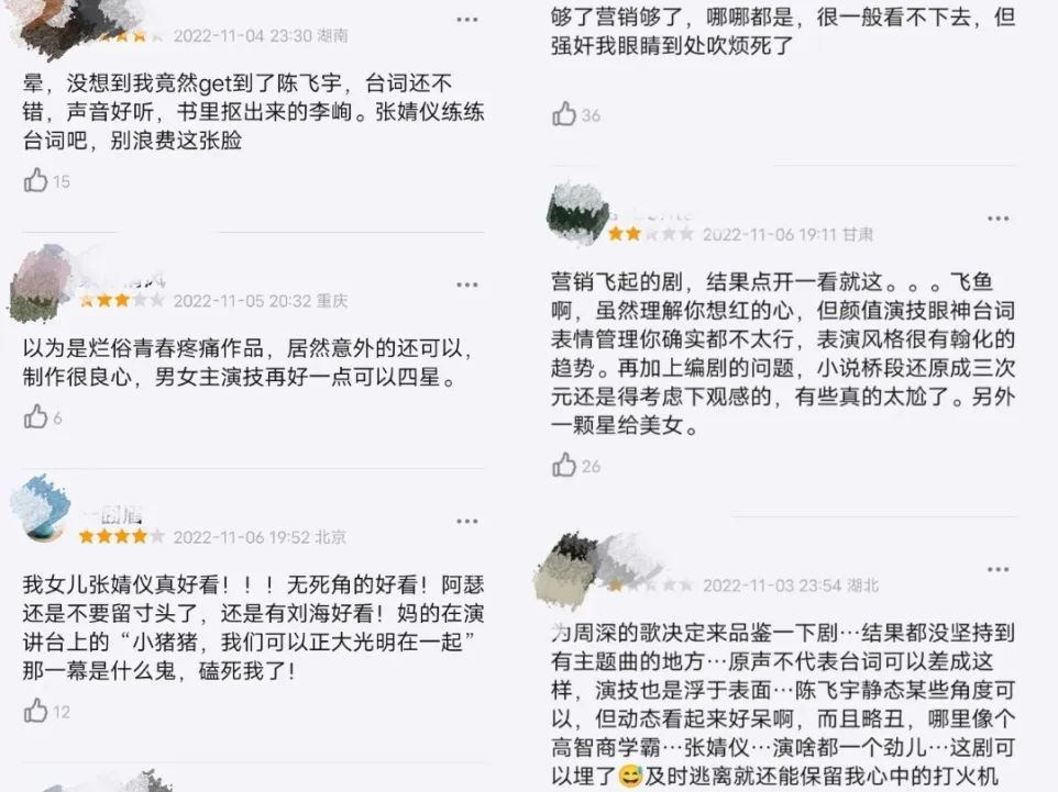 抨击的人则更倾向于从自身的经验和喜好出发对该剧进行审判,主要聚焦于演技、颜值、人设、改编逻辑、故事本身意向、情节、营销这几个方面。主要槽点包括但不限于男女主演技不佳、男女主颜值不完美及CP感弱、原著的尖锐被大幅度柔化、情节俗套、节奏拖沓、男主目中无人没礼貌没素质、女主倒贴恋爱脑、标准的自我感动式爱情、烂俗的青春疼痛文学、营销太多、故事本身苍白无聊、剧情悬浮脱离现实生活、逻辑不明、剧情叠加排列组合,剧组想刻画的完美印象在观众的对抗式解读下溃不成军。