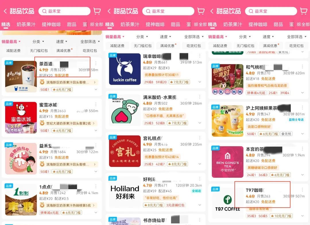 更为显眼的是,在这家门店的两旁,便是瑞幸咖啡与蜜雪冰城全资品牌幸运咖的门店。这家T97的店员告诉AI蓝媒汇,不光是他们一家店,在杭州、成都等多个城市的T97门店均位于瑞幸咖啡或星巴克咖啡的附近。