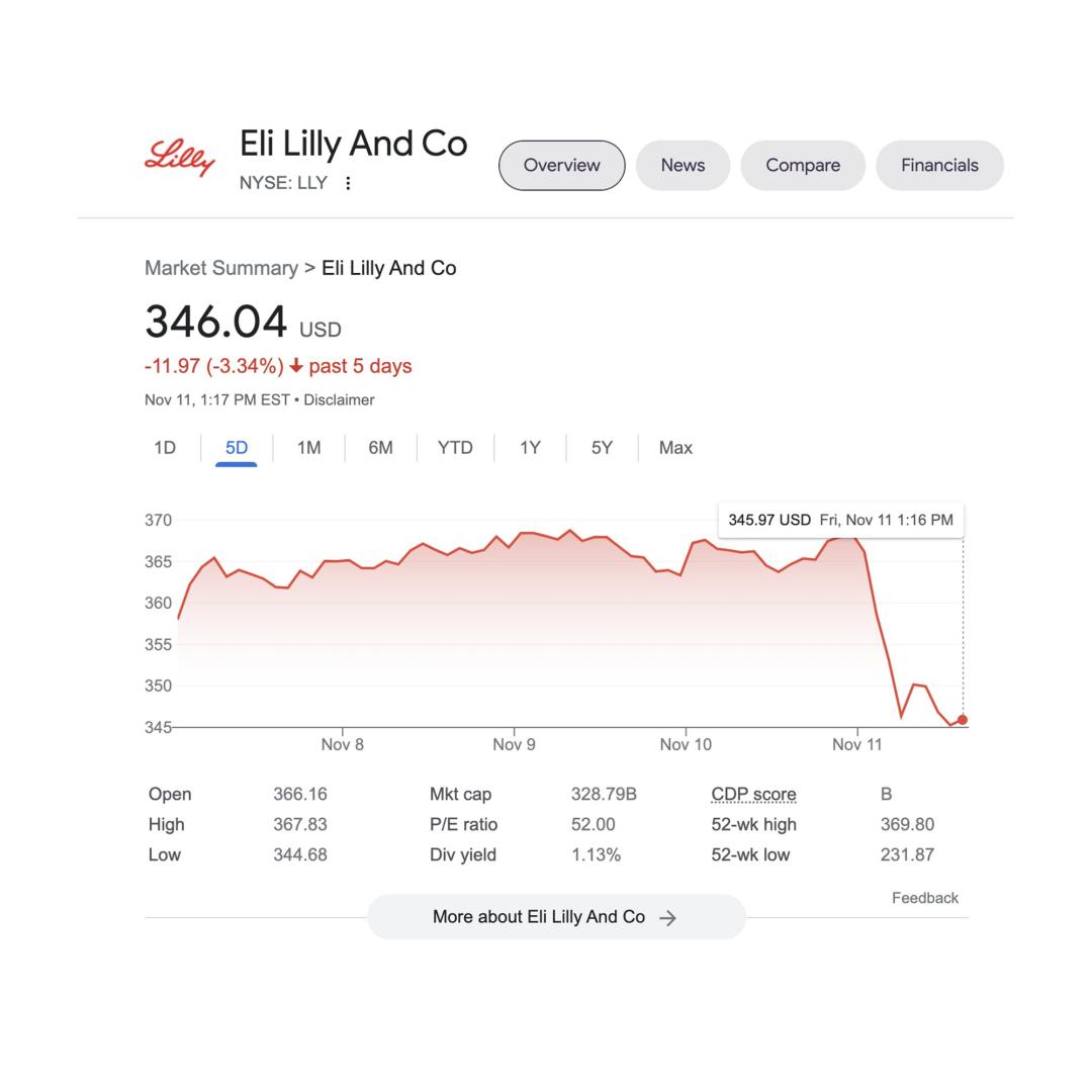 这条消息获得了推特用户的海量转评赞,然而到了第二天开盘,礼来股价因这条推文应声大跌超4%,市值蒸发约140亿美元 [1]。一同被拉下水的还有诺和诺德(Novo Nordisk)和赛诺菲(Sanofi),它们和礼来三足鼎立,供应着整个美国市场和全球市场90%的胰岛素 [2]。